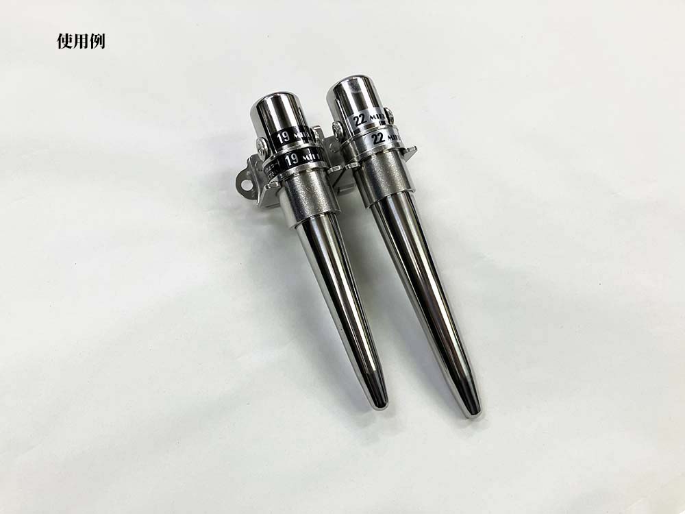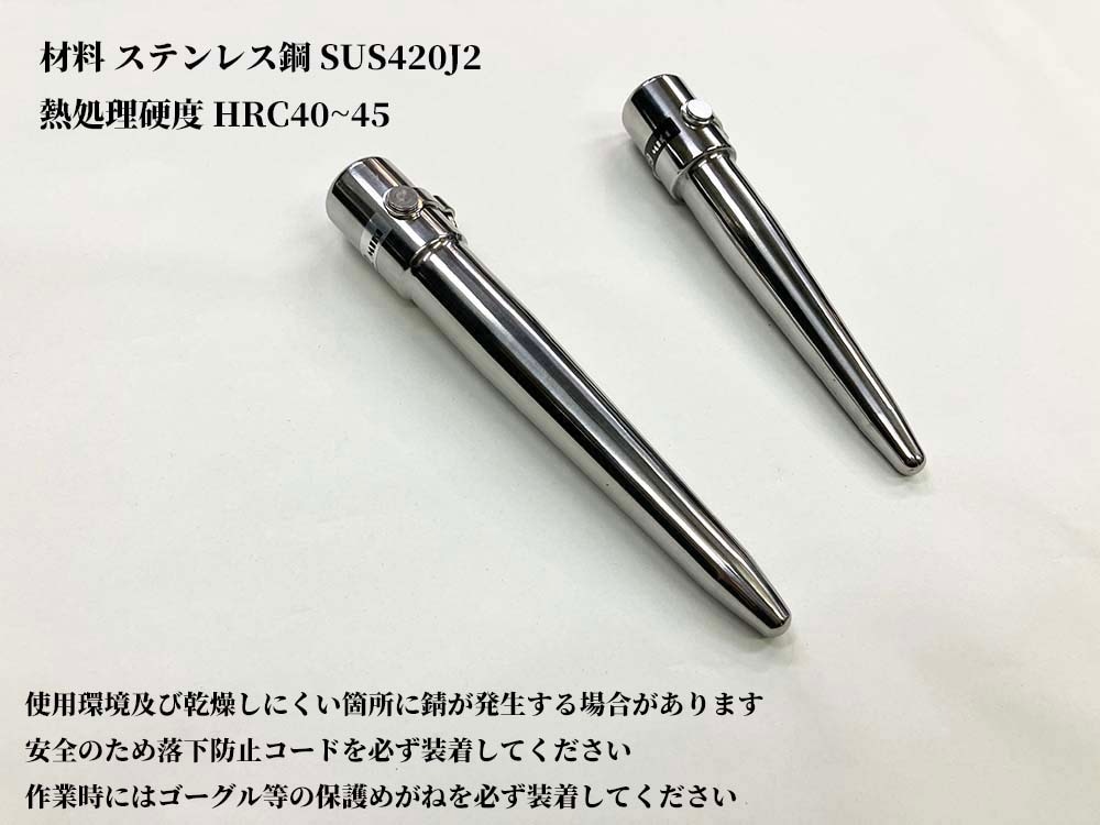 MIKI 三貴 ボール芯 ヨセポンチ YB19(6分) YB22(7分) 材料 ステンレス鋼 SUS420J2 熱処理硬度HRC40~45 ※ 使用環境及び乾燥しにくい箇所に錆びが発生する場合があります 安全のため落下防止コードを必ず装着してください 作業時にはゴーグル等の保護めがねを必ず着用してください YB19(19㎜6分) 全長約165㎜ 重量420g YB22(22㎜7分) 全長185㎜ 重量約525g